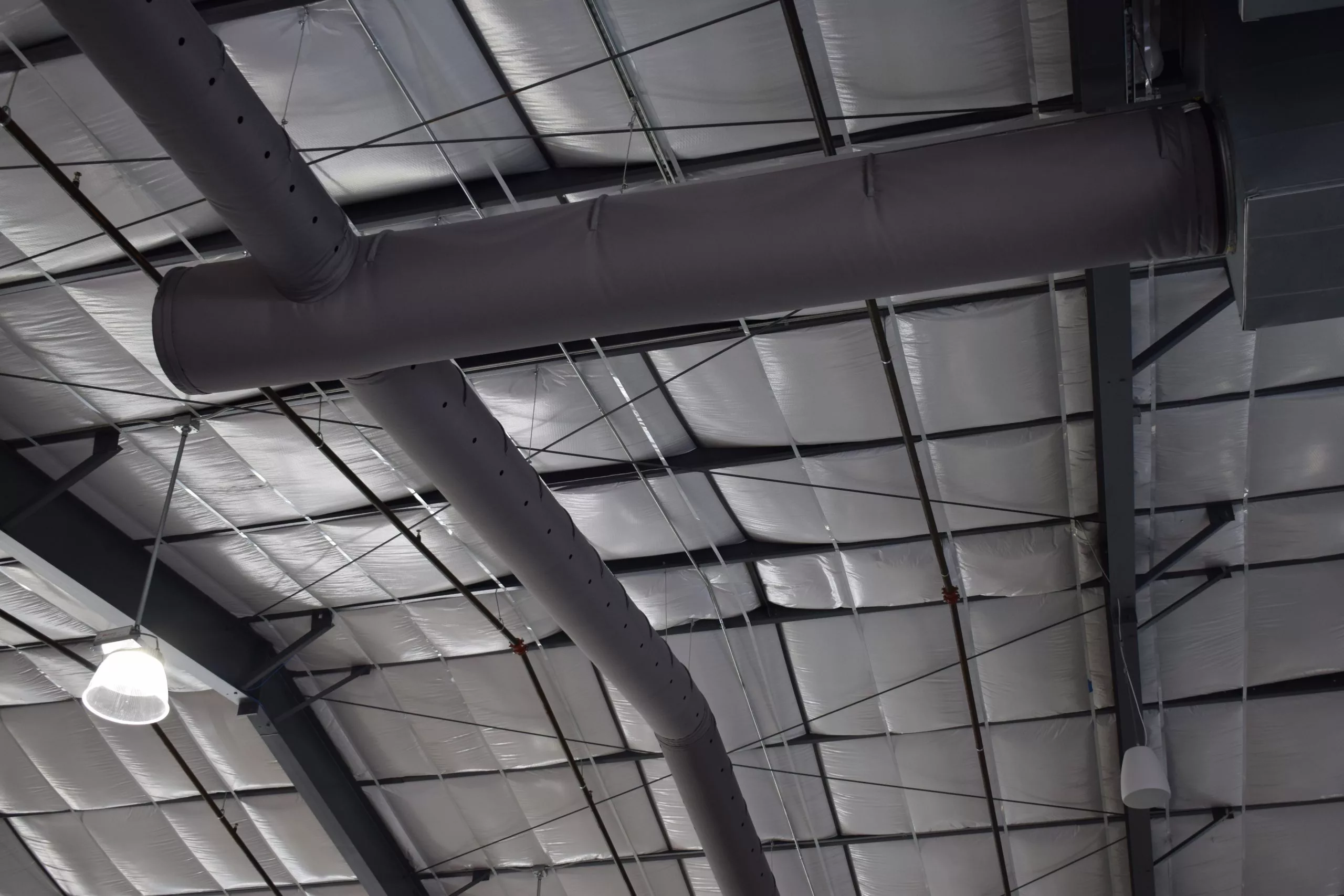 Naudodama oro srauto išpūtimo modelių OriFlow ir FabFlow derinį, komanda sukūrė idealią sistemą. Pralaidus audinys užtikrina, kad ant ortakių nenusėstų dulkės, o platus OriFlow išpučiamas srautas sukuria komfortišką aplinką be skersvėjų bendroje erdvėje, nepaisant santykinai aukštų lubų. Ortakiai būtų pakabinti naudojant Type 8 All-in-One pakabinimo sistemą, taip užtikrinama estetiška išvaizda net ir išjungus orą. Sistemą iš viso sudaro 120 metrų ortakių.