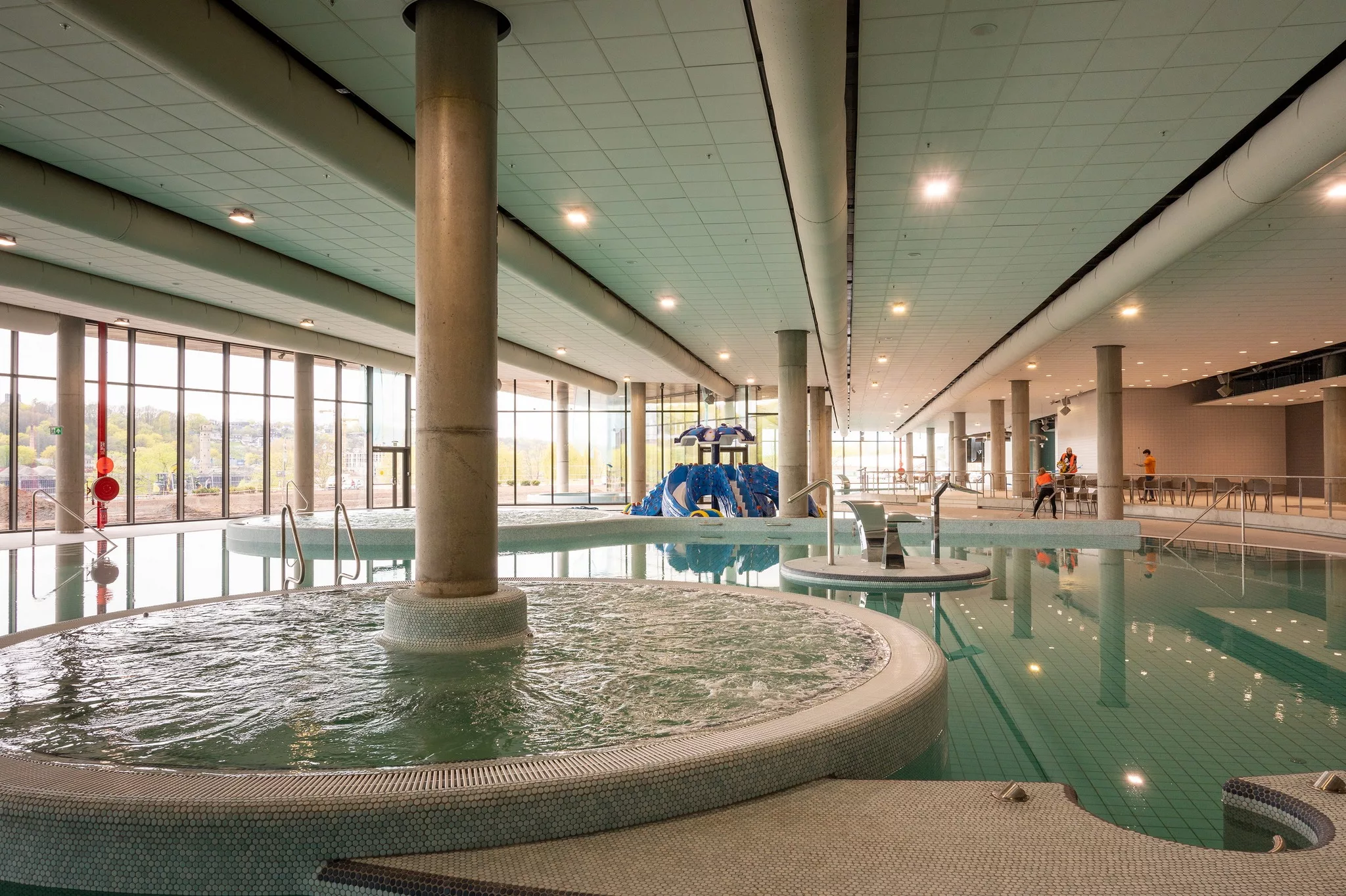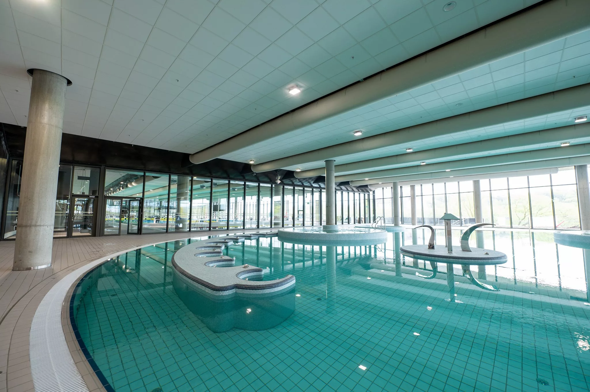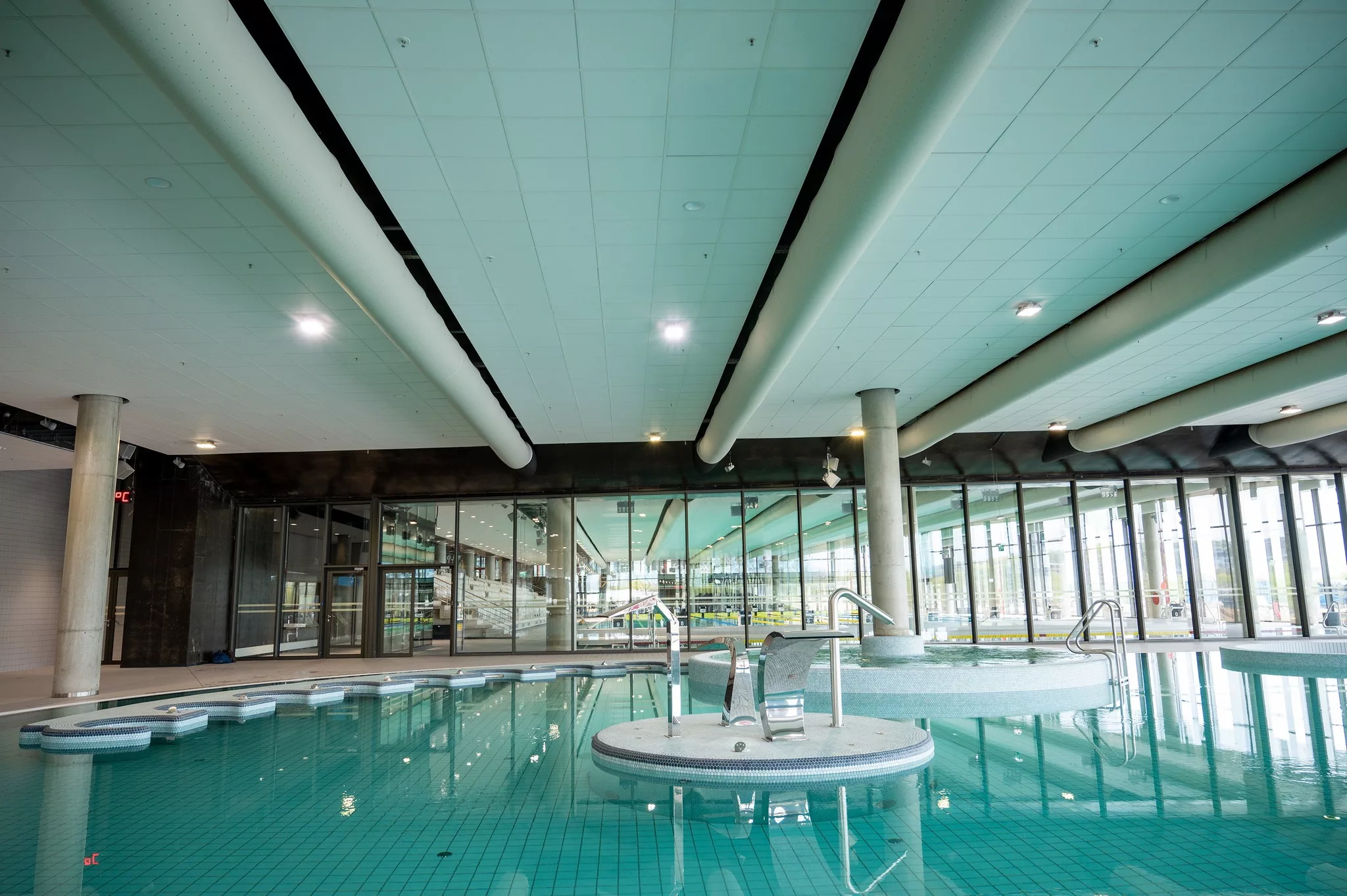 Olimpinio standarto 50 metrų ilgio 10 takelių plaukimo baseinas (atitinkantis FINA reikalavimus), 528 vietų žiūrovų tribūnos, 8 metrų gylio, 25 metrų ilgio vaikų mokymosi baseinas, 6 000 kv. m ploto dviguba SPA zona, kurioje siūloma daugybė vandens pramogų. Visose šiose vandens zonose turėjo buvo įrengtas specialiai šiam objektui sukurtas oro paskirstymo sprendimas, integruotas į bendrą naujo statinio interjero dizainą Kaune.