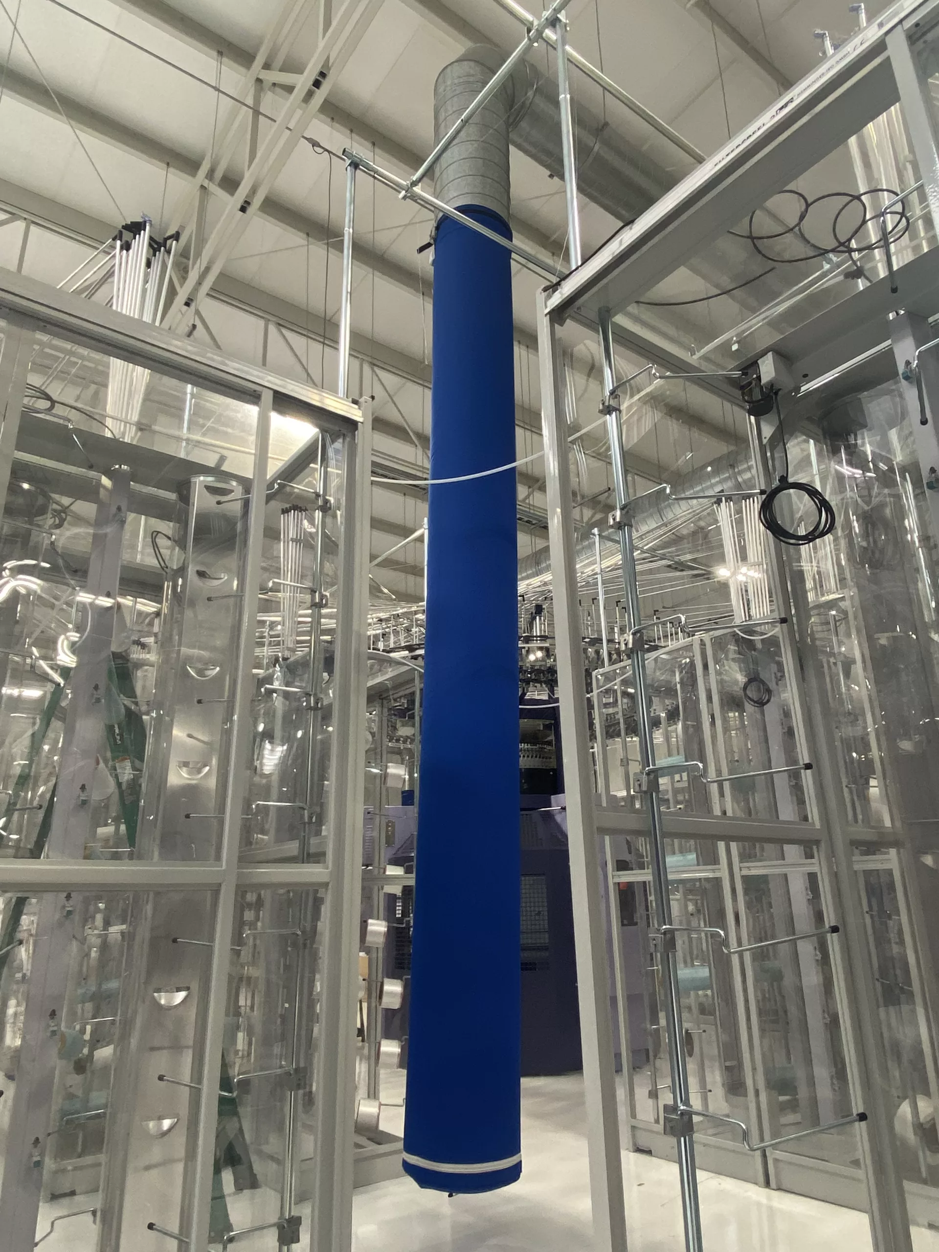 En el área de la instalación donde trabajan las personas, se cuelgan ductos horizontalmente desde los techos altos para dirigir el flujo de aire hacia el espacio ocupado, mejorando la comodidad de los empleados. Para enfriar las áreas alrededor de las máquinas de tejer, FabricAir incorporó ductos textiles verticales para desplazar el aire caliente hacia arriba, manteniendo el aire más fresco cerca de las áreas de trabajo. Este enfoque innovador ayuda a Sunds a ahorrar energía al dirigir el aire frío exactamente donde se necesita, un desafío común para instalaciones con techos altos.