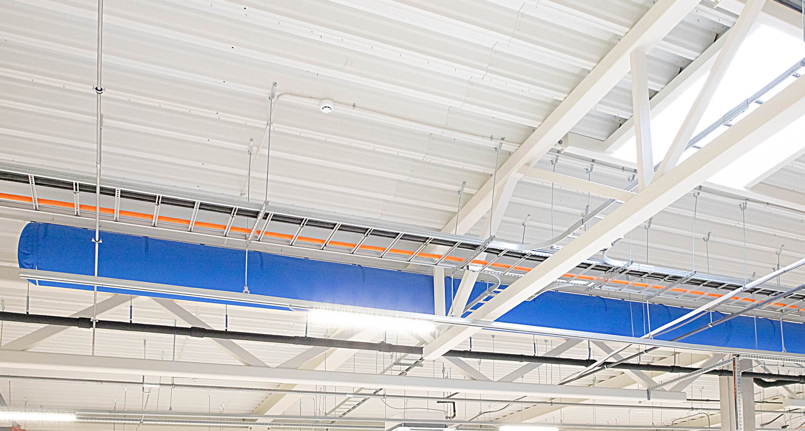 The fabric ducts are suspended with FabricAir’s Type 8 suspension, which combines anodized aluminum H-rails with intermediate cable drops from the ceiling. This setup not only provides support but also ensures the ducts retain their shape for a complete and professional appearance, thanks to the All-In-One shape retention feature.