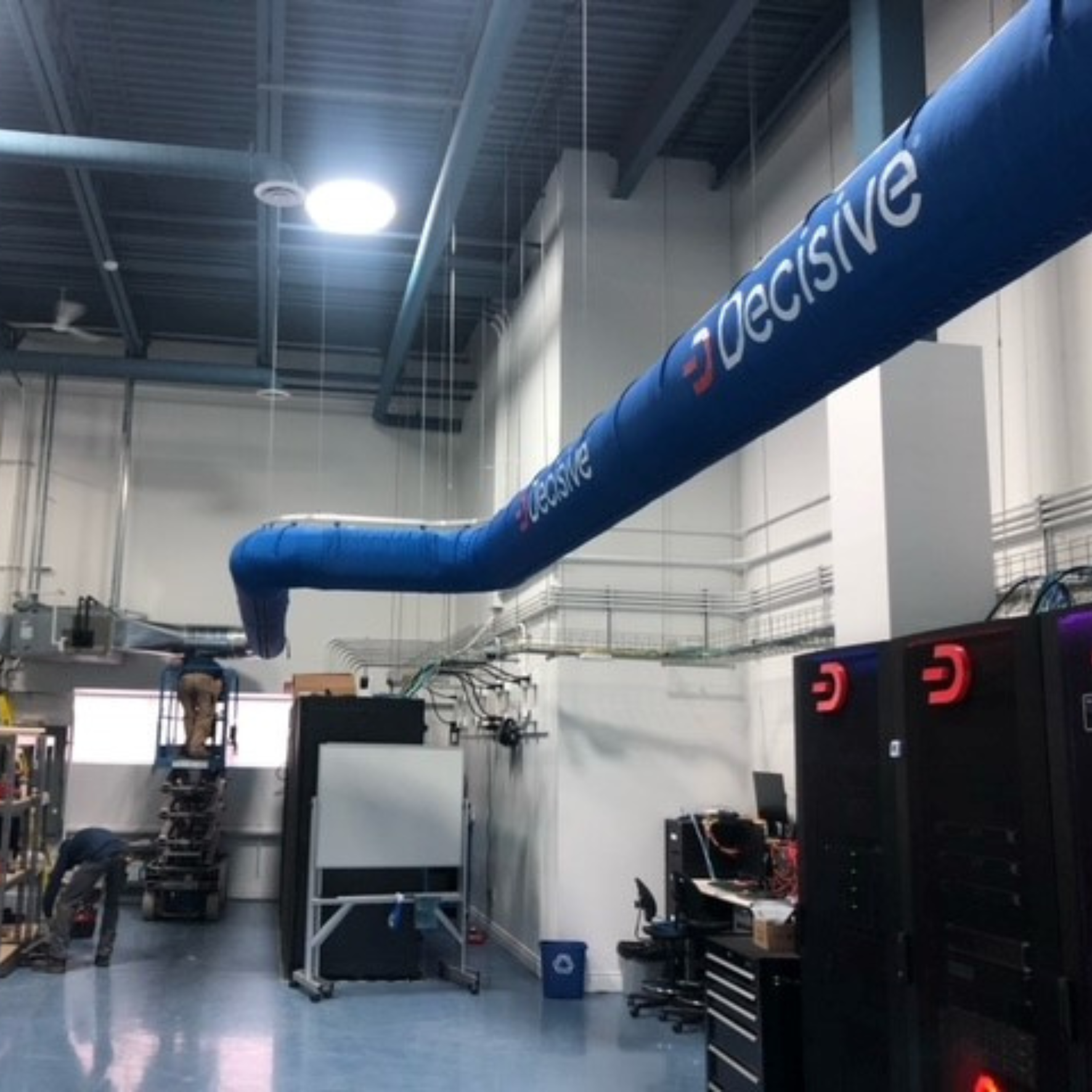 Kanada’nın Ottawa şehrinde bulunan Decisive Group, veri merkezinde hava akışını ve soğutmayı iyileştirmek için FabricAir kumaş hava kanallarını tercih etti. Decisive Group logosuyla özel olarak tasarlanmış parlak mavi kanallar, tesisin estetik görünümüne uyum sağlarken, hassas sunucu ekipmanlarının performansını korumak için doğru hava akışını sağlıyor.