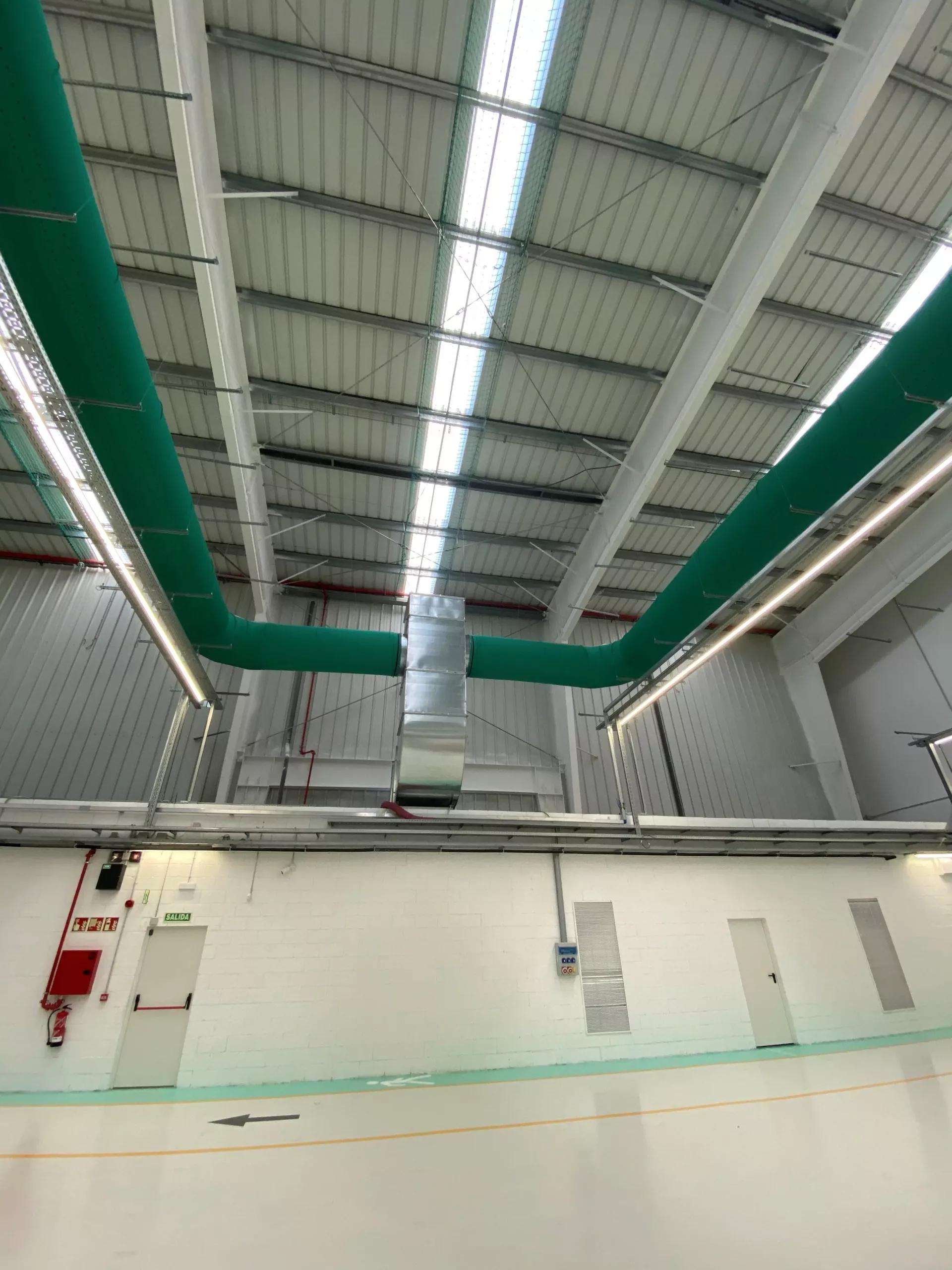 A total of 300 m of green textile ducting was installed in the warehouse, aligned with its philosophy of environmental responsibility. The solution is suspended by anodized aluminum rails that comply with REACH and RHOSS recycling regulations. In addition, this system simplifies assembly and disassembly of the textile ducts with large diameters.